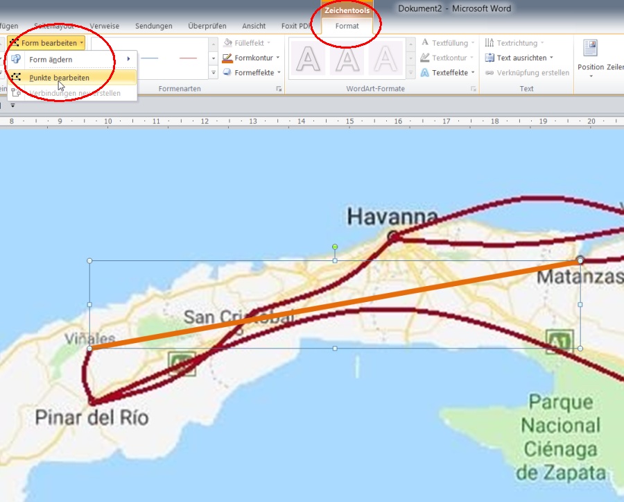 Deine Karte legst du nun über "Bildtools", "Format", "Zeilenumbruch" "Hinter den Text", damit du deine Routen-Zeichnung darüber einfügen kannst.
