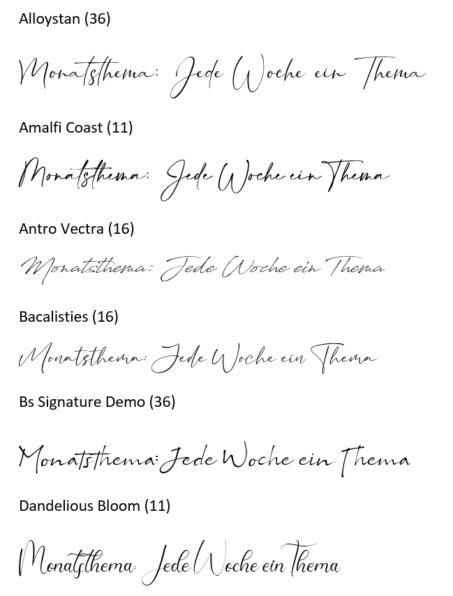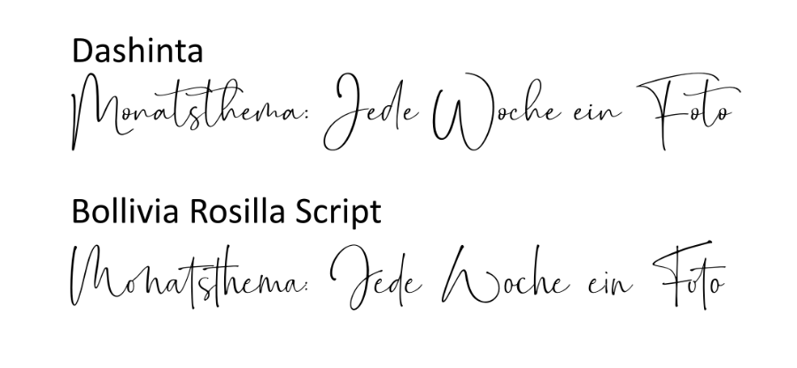 Ich verwende ganz gerne die Dashinta oder Bollivia Rosilla Script. Für mich ich es immer eine individuelle Geschmacksfrage, ob etwas passt oder nicht. Die Casual beispielsweise ist mir zu schnörkelig.