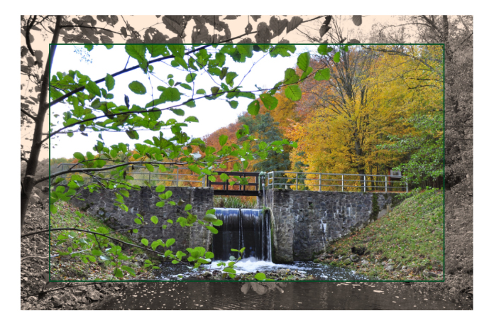 Höhe des Hauptbildes skalieren, Transparenz des Hauptbildes wieder auf 0% setzen, Transparenz des Außenbildes auf ca. 30 – 50 % setzen, Ebenen tauschen* und beide Ausschnitte erneut in Deckungsgleichheit bringen.