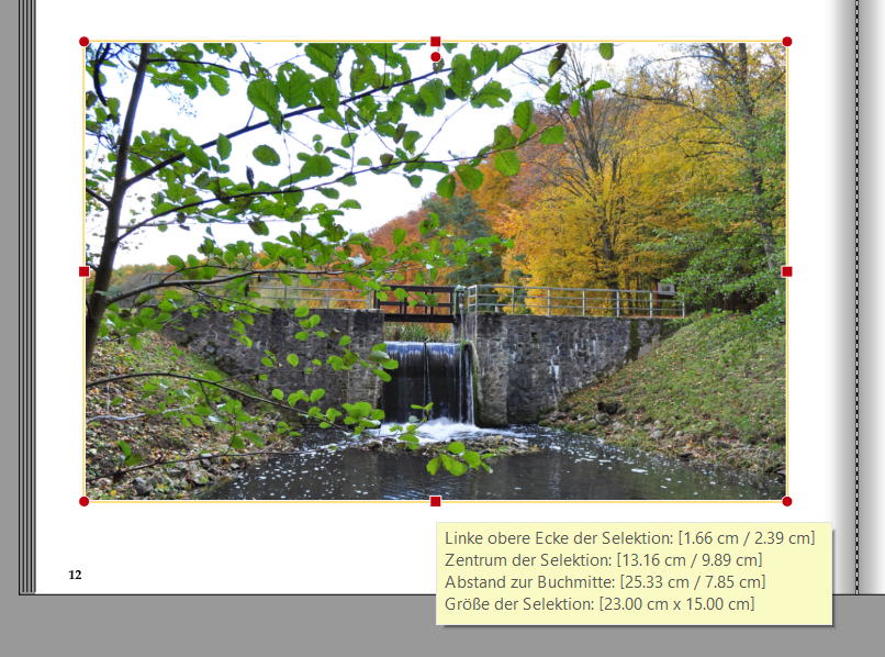 Im Beispiel ist der Rahmen ist der Rahmen 1,5 cm breit. Die Breite des kleineren, zentralen Bildes beträgt somit: 23 cm – 3 cm = 20 cm. (In Version 5.1.5 muss bei größeren Bildern auch die (zunächst identische) Höhe erneut eingegeben werden.)