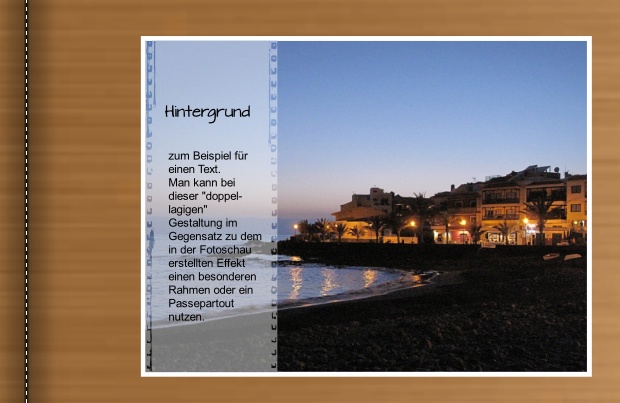 4. Die Transparenz des zentralen, kleineren Bildes wider auf 0% setzen. Wer will, kann noch einen Rahmen hinzufügen. Das größere Bild mittels Fotoschau/ Effekte bearbeiten (sepia, schwarz-weiß, starke Konturen etc.)