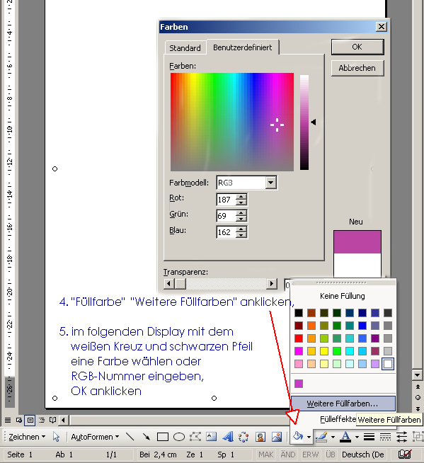 5. im folgenden Dialogfenster mit dem weißen Kreuz und dem schwarzen Pfeil eine Farbe wählen oder im RGB-Bereich z.B. mit einem Farbaufnahmewerkzeug (JustColorPicker o.ä.) ermittelte Farbwerte eintragen.