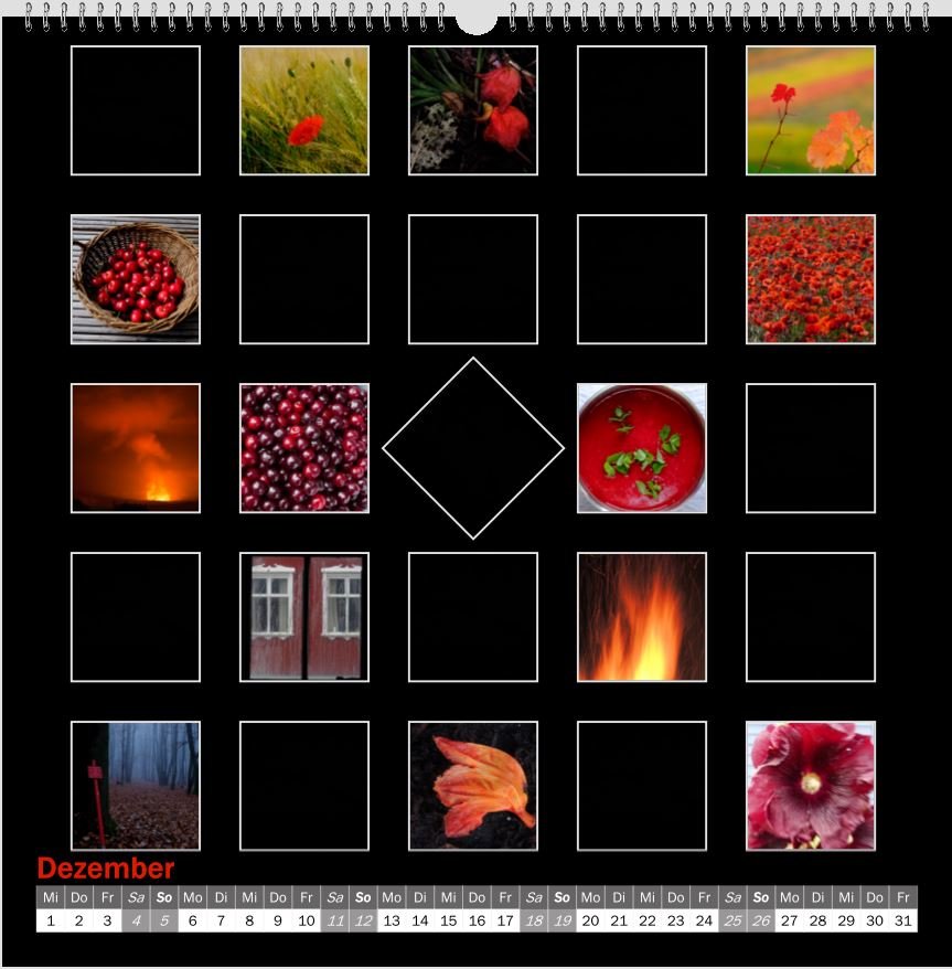 Auch ich gestalte für meine Mama jedes Jahr einen - was das Layout betrifft - relativ simplen Kalender mit im vorhergehenden Jahr selbst geschossenen Bildern. Dabei sollen die, tendenziell wenigen Bilder, für sich sprechen.