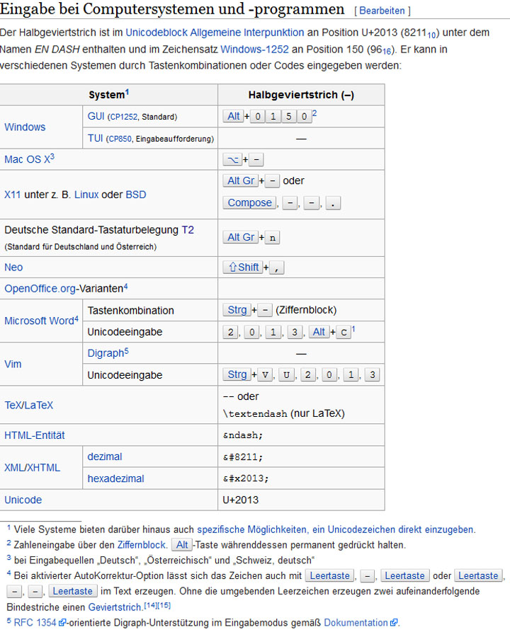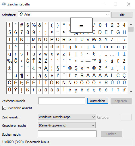 Eine Möglichkeit habe ich indem ich die Sonderzeichen von dieser Tabelle hineinziehe, zahlt sich für den Bindestrick nicht aus, aber für andere interessante Zeichen vielleicht schon.