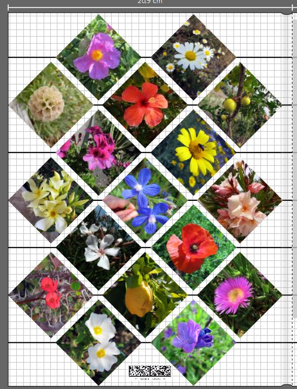 danke für die Tipps und schnellen Antworten. Mit dem Raster (5; 3,5 und 2,5 cm) hab ich experimentiert, aber die Software scheint das Raster nicht vom Seitenrand (z.B. oben Links oder rechts) anzulegen. Das hat dann nicht so richtig gepasst. Also hab ich den Tipp mit Raster und Linienclippard kombiniert. Die Linien zur Ausrichtung am Raster 0,5 cm benutzt. Danach dann die Fotos ausgerichtet. Zuletzt die Hilfslinien wieder entfernt Bin so zufrieden, s.u. Schönes Wochenende Euch allen, danke und liebe Grüße Blicki