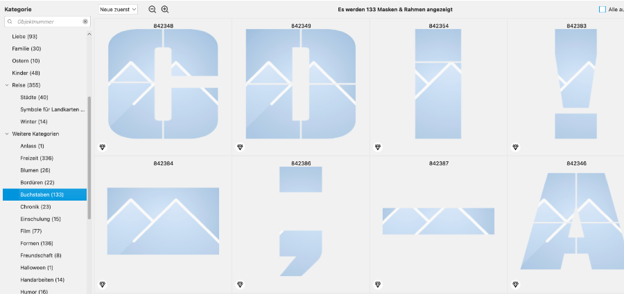 Werden Dir im Downloadportal unter dem genannten Pfad 133 Elemente bei Buchstaben genannt? Dann sind sie dort auch verfügbar. Ggf. musst Du hier scrollen. Wenn Du den Filter auf Masken setzt, werden nur die alten Buchstaben angezeigt. Die neuen Buchstaben hat CEWE als Rahmen angelegt. Also hier ggf. den Filter rausnehmen bzw. entsprechend umhäkeln. (Danke an okular für den entsprechenden Hinweis im anderen Thread.)Liebe Grüße