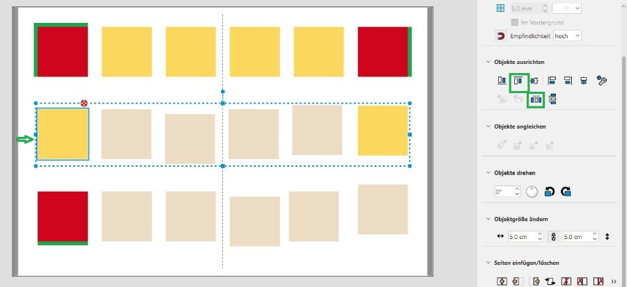ich habe für Dich und evtl. andere stille Mitleser mal eine ausführliche Screenshot-Doku erstellt, wie ich Deine Seite ausrichten würde. Dabei gehe ich davon aus, dass alle Bilder bereits auf der Doppelseite liegen, wie von Dir gezeigt. Zuerst müssen alle Bilder auf die gleiche Größe gebracht werden. Das geht mit der Tastenkombi ALT+G oder mit dem hier markierten Icon über den Reiter "Ausrichten". Sind alle Bilder gleich groß, erfolgt das Ausrichten. Hierzu benötigst Du 3 Eckbilder, die Du an ihrer endgültigen Position platzierst. Ich habe diese auf meinem Screenshot rot gestaltet und die Kanten, welche endgültig ausgerichtet sein müssen, grün markiert: Bild unten links muss unten ausgerichtet sein. Bild oben rechts muss rechts ausgerichtet sein. Alle anderen Bilder können lose herumliegen. Dann markierst Du zuerst das Bild links oben und anschließen die weiteren fünf Bilder der oberen Reihe von links nach rechts und richtest sie mit den markierten Icons an der Oberkante und mit gleichem Abstand miteinander aus. Jetzt markierst Du wieder das Bild links oben und anschließend die weiteren zwei Bilder der linken Spalte von oben nach unten und richtest sie mit den markierten Icons an der linken Bildkante und mit gleichem Abstand miteinander aus. Anschließend markierst Du das Bild rechts oben sowie die weiteren zwei Bilder der rechten Spalte und richtest sie mit dem markierten Icon an der rechten Bildkante miteinander aus. Nun markierst Du die mittlere Bildreihe mit der Gummibandmethode startend von links nach rechts und richtest alles mit den markierten Icons an der oberen Bildkante sowie und mit gleichem Abstand miteinander aus. Mit der unteren Bildreihe verfährst Du genauso wie mit der mittleren Bildreihe. Alle Bilder sind nun miteinander gleichmäßig ausgerichtet. Liebe Grüße