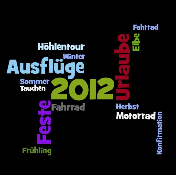 Dies kann man mit gängigen Grafikprogrammen gestalten oder auch über einen Internet-Seite generieren lassen. (z.B. http://www.wordle.net)