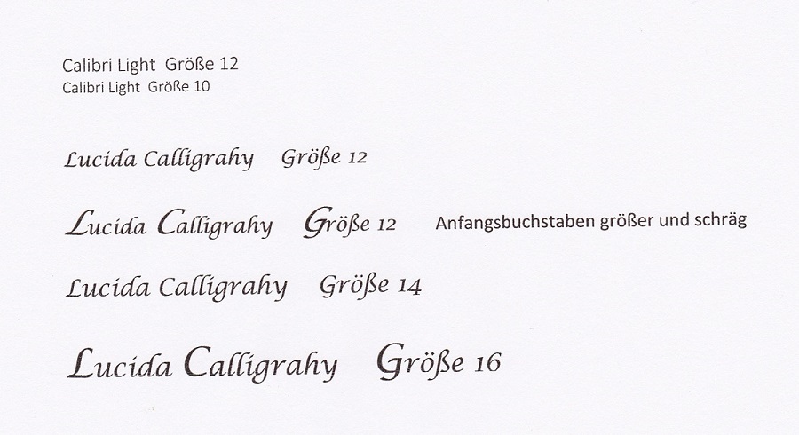 Calibri Light Größe 12 Calibri Light Größe 10 Diese Schriftart nehme ich für Überschriften. Ich mache oft den 1. Buchstaben Größer wie die anderen und schräg. Lucida Calligrahy Größe 12 und Größer Je nach Geschmack, Laune und zu was ich gerade den Text brauche, je nach Bildmaterial. LG Re: Mit Schriftarten gestaltenHallo,