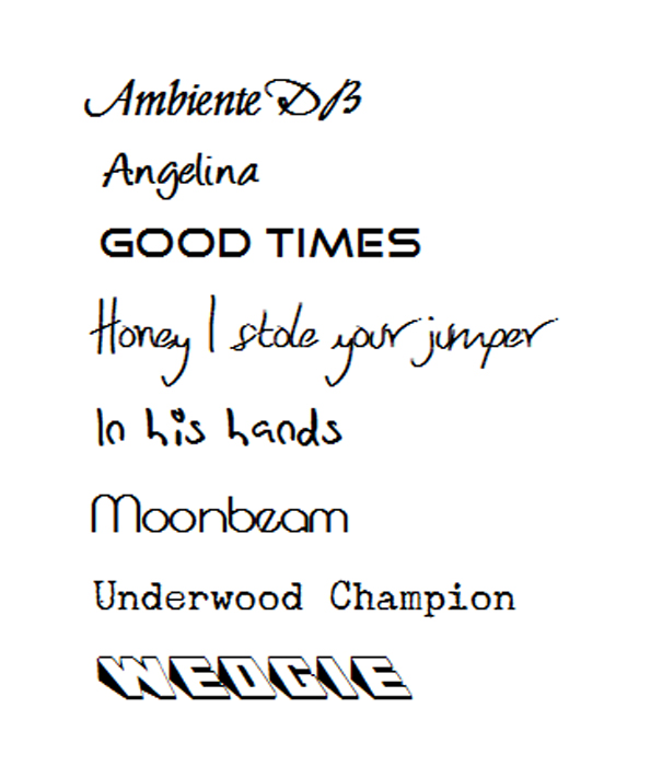 Re: Mit Schriftarten gestaltenHier meine beliebtesten Schriftarten. Für Cover (hauptsächlich Jahresbücher) nehme ich gelegentlich die im Anhang fetten Buchstaben, oft gestalte ich die Schrift aber mit Photoshop aus ganz einfachen, wie Arial oder Times, dann mit abgeflachten Rändern und entsprechender Schattierung.