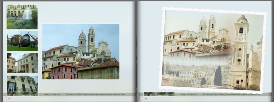 Mir gefällt die Idee mit der Postkarte von Josefia ausgesprochen gut. Mir gefällt auch, dass sich der "antike Effekt" auf ein Bild beschränkt. Das bringt den Effekt besser zur Geltung und die Gestaltung mit der Postkarte gibt dem Effekt einen Rahmen. Die linke Seite mit 4 + 1 Foto, wie im ersten Screenshot von Meimar14, gefällt mir auch gut.