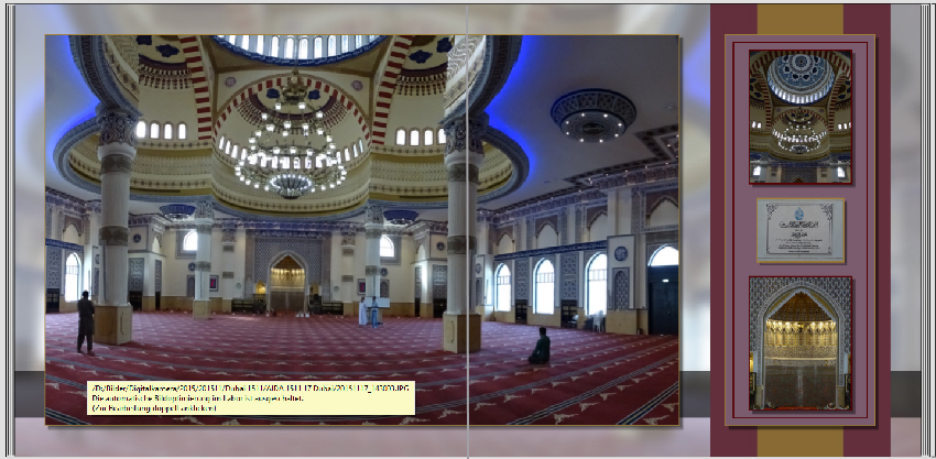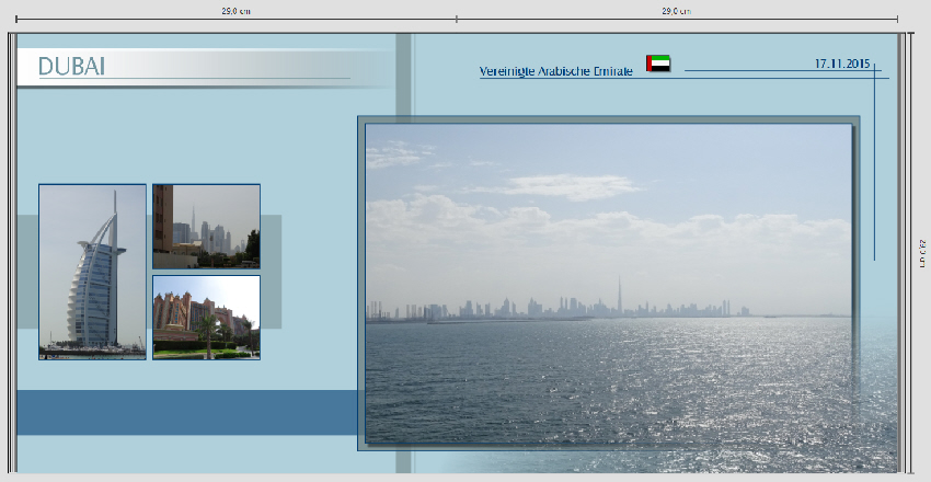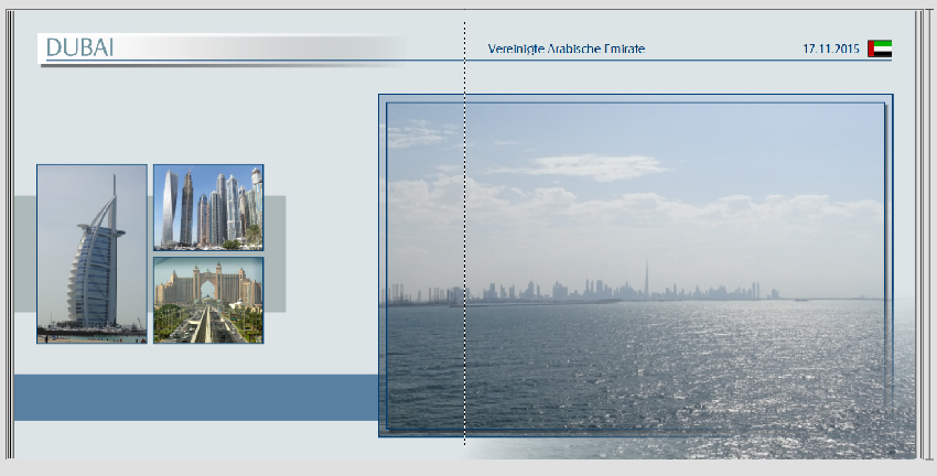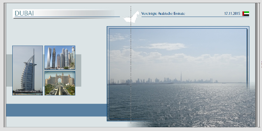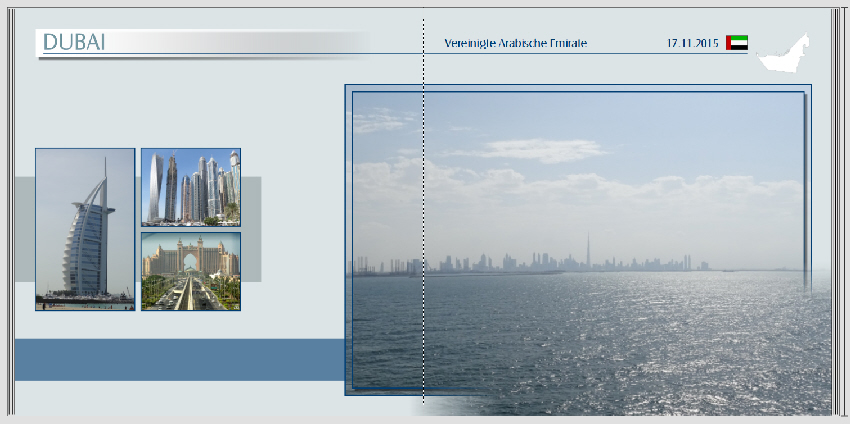 Ich persönlich finde die Schrift aber zu groß, wenn es tatsächlich auf jeder Seite erscheint. Außerdem hat man irgendwann ja mal kapiert, dass man jetzt in Dubai ist. Deshalb wäre es evtl. eine Idee, lieber hinzuschreiben, welches Gebäude, Stadtteil etc. das ist. Nur meine Gedanken dazu ... Viel Spaß weiterhin beim Gestalten. Gruß DSL-schnell