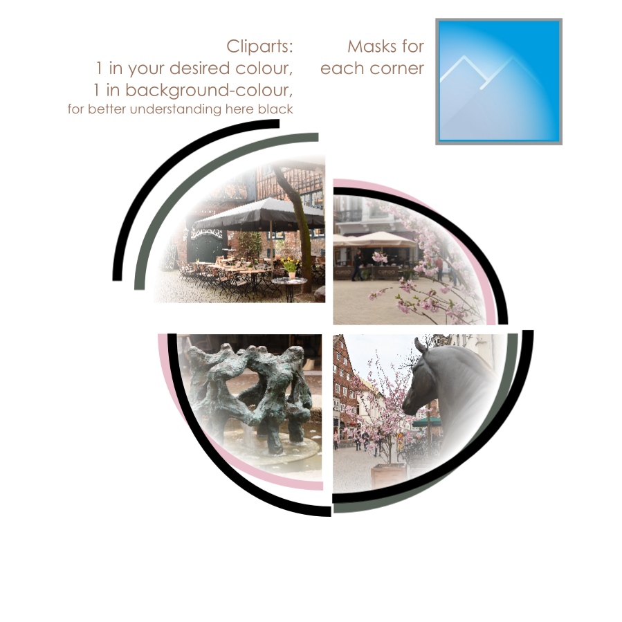 Hi Josefia,I think, this is a quite tricky layout. Anyway, I've tried to make an explanation. Each quarter seams to be made with a picture with quadrant-mask and two quarter-circle-cliparts. One of the cliparts (in your desired colour) has nearly the same size as the picture. You just have to align it with the picture. The second clipart has to be in background colour. This clipart creates the gap. You have to play around with the size of this clipart until you are satisfied If you want, you can add straight cliparts as a border. I wouldn' t do so. Viertelkreis-Gestaltung1.jpg Viertelkreis-Gestaltung2.jpg I wish you good luck Thank you very nu ch for the explanation Kind regards