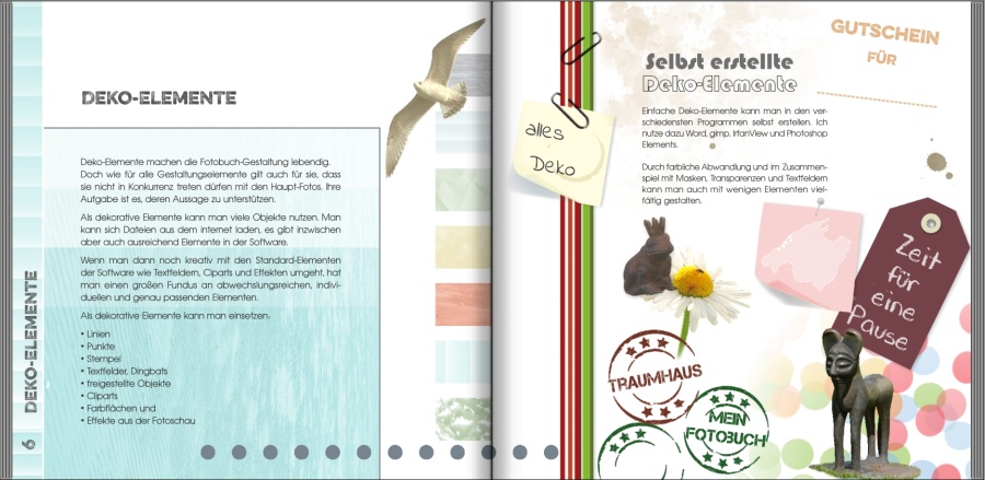 Wenn das Fotobuch lebhafter und verspielter werden soll, dann muss es auch "voller" werden. Damit meine ich, die Elemente müssen dichter zusammen sein, evtl. farblich etwas zurückgenommen oder mit Transparenz versehen, aber nicht so isoliert wie jetzt.