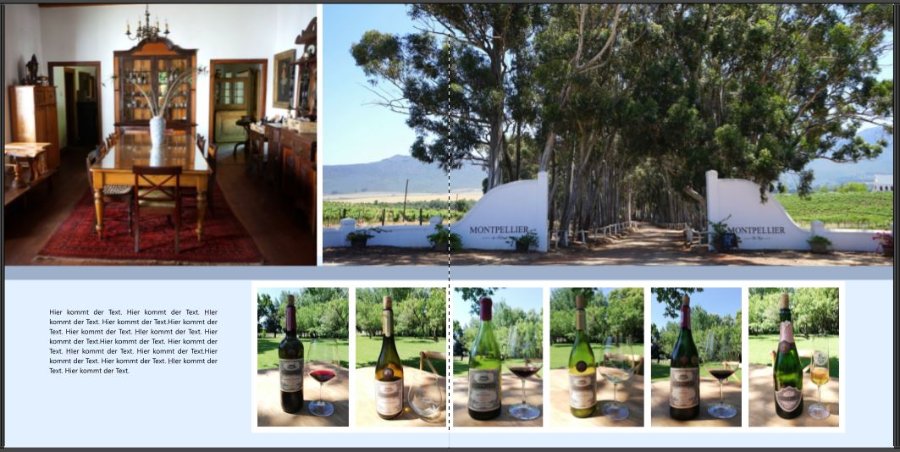Re: Gestaltungsideen Südafrika WinelandsIch bin nicht der Gestaltungs-Guru und liege mit meinen Einschätzungen meistens daneben. Was mir an der ersten Gestaltung (Saronsberg) aber nicht so gut gefällt, ist die Ausrichtung auf der linken Buchseite. Ich würde die Bilder oben und unten und den Textblock dazwischen auf einer Linie und gleicher Breite ausrichten. Die unteren Fots auch entsprechend anpassen. Evtl die oberen beiden Fotos auch an die Mitte verschieben und die Bildbreiten dann entsprechend ausrichten. So wirkt es auf mich irgendwie unruhig.
