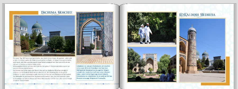 Mit meinem neuen Projekt bin ich so auf Halbzeit. Genug, um sich ein paar Gedanken zu machen, ob es passt oder nicht. Irgendwie hänge ich grad wieder fest. Selbst ist man ja nun schon soweit im Buch, dass es nicht schadet, wenn mal ein paar neutrale Augen auf das Werk schauen. Mein Stil soll nach wie vor eher klar bleiben, das Land (Usbekistan) gibt aber schon etwas mehr her. Ich habe nun extern einen Hintergrund gefunden, der zum Baustil passt. Ist das zu dominant? Ich habe immer mal wieder Verlaufsmasken drauf gelegt. Die Farben des Landes sind alle Blau-Töre und viel Gold, je nach Region aber auch Lehm. Was will ich ausdrücken? Die Schönheit des Landes und der Gebäude. Aber natürlich auch unsere persönlichen Erlebnisse. Die Textfelder sind unterchiedlich, ob Bericht oder Information. Die Infos will ich wieder als Blocksatz machen, das mache ich aber erst, wenn die Gestaltung steht. Auf einer Seite habe ich mal probiert, ob goldenen Farbränder oder auch Farbfelder evtl. gefälliger sind als das Blau, hab da etwas ausprobiert. Ich bin gespannt, ob ich durch euch wieder in die Spur komme. LG und schon mal vielen Dank Monika