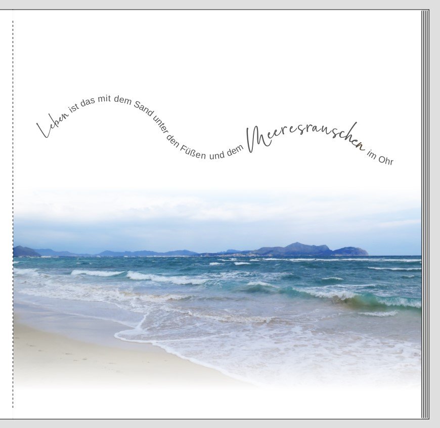 "Leben": normales Textfeld, keine TextArt, 28pt, Drehung -38° "ist das mit dem Sand unter": TextArt, 18pt, Zeichenabstand 1,2pt, Drehung 1°, Textfeldgröße 9,9 x 9,3 cm "den Füßen und dem": TextArt, 18pt, Zeichenabstand 1,0pt, Drehung 8°, Textfeldgröße 9,4 x 10,7 cm "im Ohr": TextArt, 18pt, Zeichenabstand 1,0pt, Drehung 22°, Textfeldgröße 5,3 x 3,6 cm Mit Drehung meine ich jeweils die Einstellung im Reiter "Anordnen" bei "Objekt drehen". Der Schieberegler bei TextArt steht jeweils unverändert auf 0°. Mit den Zeichenabständen muss man ein wenig spielen, was je nach Textfeldgröße usw. optisch gut passt. "Meeresrauschen" habe ich aus diversen einzelnen Textfeldern gestaltet, damit es optisch für mich gut aussieht. Bei Deiner Schrift musst Du da evtl. auch ein wenig ausprobieren. Ich habe "M", "eeresrausch", "e" und "n" in einzelnen Feldern jeweils in 40pt, mit einem Zeichenabstand von 2,9 pt angelegt. "eeresrausch" ist dabei auf -8° gedreht und in einem Textfeld mit den Maßen 7,4 x 4,3 cm untergebracht. Die restlichen einzelnen Buchstaben sind dann nach Gutdünken und Gefallen gedreht und ausgerichtet. Links und rechts zum Seitenrand bzw. zur Seitenmitte bleiben mir mit der Gestaltung zwischen 1,5 und 2,0 cm. Danke übrigens für die schöne Idee. Liebe Grüße