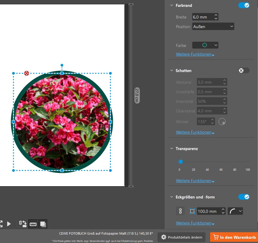 du bringst ein Foto auf ein quadratisches Format, wählst bei Eckgrößen und -form 100,0mm, wählst dann einen passenden Farbrand - und das Foto ist rund umrahmt.