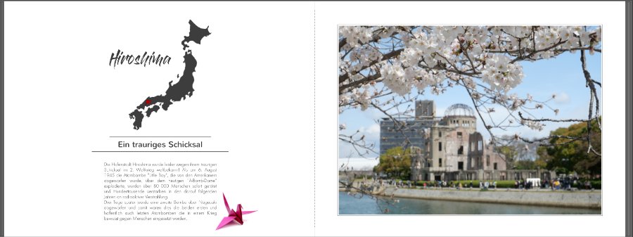 Das hatte ich anfangs so (die kürzeren Ortschaften sind auch größer geschrieben), aber wenn ich Hiroshima größer schreibe, steht es so weit nach links und ergibt mit der Karte zusammen kein einheitliches Bild mehr. Hoffe ich habe halbwegs verständlich erklärt, was ich meine. Du könntest einmal versuchen, den Namen (Hiroshima) sehr viel größer zu schreiben. Dann passt das vollflächige Foto eventuell besser. Liebe Grüße,