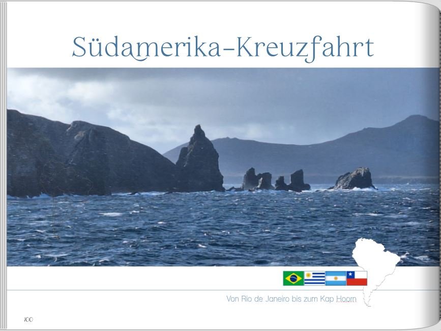 Das 1. "a" in Südamerika und das "f" in Kreuzfahrt habe ich in der Deko-Variante der Schrift gesetzt, um mit den Schnörkeln mehr Lebendigkeit abzubilden