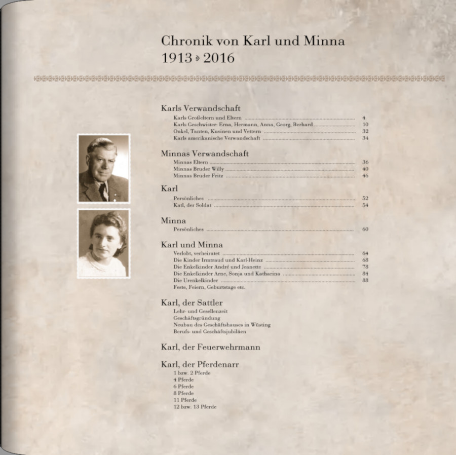Da es sich hier nicht um einen chronologischen Ablauf handelt, möchte ich noch so eine Art zweites Inhaltsverzeichnis einfügen in Form eines Zeitstrahls, wo ich die Ereignisse wie Geburts-, Hochzeits- und Sterbedaten etc. eintragen will. Ich denke darüber nach, ob ich auch die entsprechenden Seitenzahlen hinzufüge. Bisher habe ich da nur eine Aufstellung der Daten, muß noch mal sehen, wie eine Gestaltung daraus wird.