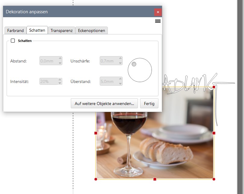 Nachdem ich nun die Optionen geändert und die Datei noch einmal neu geladen habe, werden alle neu eingefügten Bilder mit Schatten versehen. Das will ich zwar auch nicht, aber es ist einfacher, als bereits eingefügte Bilder mit Schatten zu versehen.
