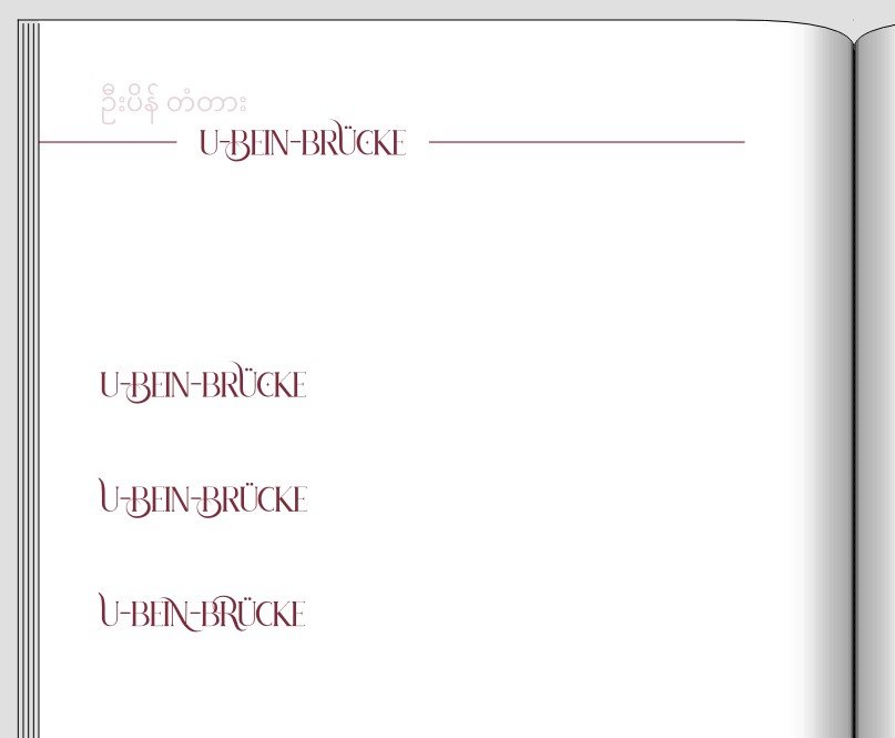 Ich persönlich finde die birmesische Schrift so wunderschön, dass ich sie auf jeden Fall irgendwo einfügen würde, die Kringelschrfit ist einfach soooo dekorativ. Vielelicht auch noch größer und klein darunten die Übersetzung (in der Brotschrift, vielleicht aber im selben Farmton, einfach damit man weiß, was die Kringel bedeuten).
