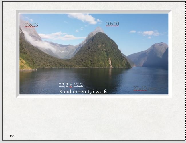 Zunächst: Mit Deinen Maßen passt jetzt grundsätzlich alles, das könntest Du also theoretisch so lassen, aber: - Der Farbrand ums Foto kann nicht weiß sein, da bereits der Fugenrahmen weiß ist. Das "verläuft" ineinander und zerstört damit die Täuschung/Optik. - Der Farbrand sollte die Farbe des Seitenhintergrundes haben. Beides sollte einfarbig und nicht strukturiert sein, sonst lenkt auch das von der Täuschung ab und zerstört sie. - Der Farbrand ums Bild sollte deutlich! breiter sein als der Fugenrahmen, sonst funktioniert die Täuschung nicht. Aktuell ist bei Dir Fuge und Farbrand optisch identisch breit. - Nach meinem persönlichen Empfinden funktioniert die Täuschung generell nicht mit einem Panoramaformat (16:9 u.ä.). Das Auge muss in der Lage sein, die beiden Ecken (o.r. und u.l.) auf einmal zu erfassen. Nur dann funktioniert die Täuschung. Liegen diese beiden Ecken zu weit auseinander, müssen die Augen hin und her hüpfen, was die Täuschung zerstört. Ideal ist also hier ein eher klassisches Fotoformat (3:2, 4:3). Ich würde in keinem Fall Text in den Fugenrahmen setzen. Auch das zerstört die Täuschung. Und ich würde die Polaroids auf eine Linie bringen, um das Auge nicht vom Passepartout abzulenken. Ich habe mit Deinem Foto und der Bildanzahl einmal gebastelt und bin bei dem zartgrauen Hintergrund (#202) geblieben. Für den Passepartout-Effekt funktionieren nur helle Farben. Meine Maße: Foto 18,1 x 10x6 cm mit Farbrand Innen 5,0 mm Clipart weiß 18,5 x 11,0 cm Dreieck groß 11 x 11 cm Dreieck klein 10,3 x 10,3 cm Einen separaten Thread zur Gestaltung lege ich gern später an. Liebe Grüße