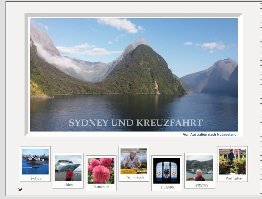 ich weiß nicht, irgendwie wirkt dein Cover so trist, auch durch den grauen Hintergrund. Dein Coverbild ist schon in Ordnung, ich würde nur dieses ganze Rahmengedöns weglassen und es etwas größer platzieren. Ich füge mal das Cover meines Buches bei, an dem ich gerade arbeite. Ich habe das untere Bild unten, rechts und links weit über den Rand gezogen und oben mit einem Verlauf auslaufend versehen. Hintergrund ist das selbe Bild weichgezeichnet. Ob ich es so lasse weiß ich nocht nicht, sind erst die ersten Schritte Vielleicht magst du das auch mal ausprobieren, evtl. auch mit einem CEWE Hintergrund in blau, Himmel oder so. Oftmals sieht dann auch ein bewölkter Himmel nicht mehr ganz so langweilig aus und du hättest auch noch Platz für einige kleinere Bilder von Sydney und unterwegs auf der Kreuzfahrt. Den Schriftzug "Mein Schiff" habe ich in meinem Buch im Original, weiß aber nicht, ob man es abbilden darf Auf jeden Fall wünsche ich dir weiterhin viel Spaß bei der Gestaltung, eine wunderschöne Reise habt ihr da gemacht
