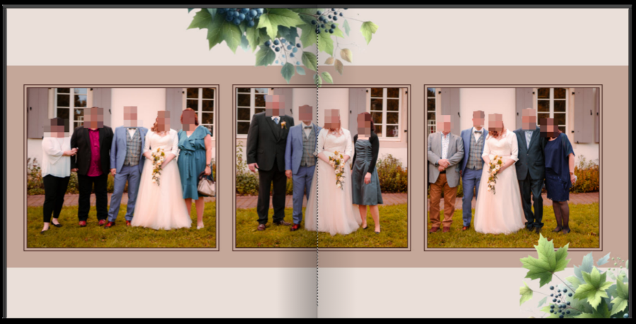 Hallo Okular,vielen Dank, dass du den Entwurf des Hochzeitsbuches mit uns teilst. Der Wegfall so mancher Cliparts mit krassen Farben hat sich sehr wohltuend ausgewirkt (bleibt nur noch das Eichhörnchen und ein Strauch mit giftgrünen Blättern Die Trennwirkung der Buchmitte, die ausgerechnet hin und wieder das Brautpaar betrifft, wurde ja schon diskutiert. Hoffentlich kommt das beim Layflat nicht so sehr zum Tragen. Hat das Originalfoto mit dem sich spiegelnden Brautpaar an der Unterseite eventuell noch etwas mehr Spielraum? Wenn nicht, würde ich vermeiden, die Enge durch die eingefügte weiße Doppellinie noch zusätzlich zu verstärken. 2024-07-15_175519_Brautpaar.jpg danke für das Feedback. Zu den giftgrünen Blättern - geht es immer noch um den Rahmen auf der Seite mit dem Trautisch? Entweder es ist mein Bildschirm oder mein subjektives Farbempfinden, aber ich sehe nichts giftiges? Finde da eher das Gesteck auf dem Tisch zu grell... Oder ist eines der Beiwerke bei den Grüppchenfotos gemeint? Das Bild mit der Spiegelung am Meer hat leider keinerlei Spielraum mehr nach unten. Es gibt zwar ein entfernteres Bild, das ist aber insbes. wegen des schlechten Wetters nicht so schön. Wie es ohne Doppelrahmen aussieht, wäre quasi in der ersten Version des Buches zu sehen, findest du das besser? Der Doppelrahmen liegt außen, überdeckt das Bild also nicht. Die Trennung der Buchmitte - da muss ich wirklich sagen genau für sowas ist Layflat doch gemacht. Und es hat ja jetzt niemand die Falz auf der Nase. Eine Trennung der Personen durch die Falz habe ich sogar schon in einer der Buchbesprechungsen von Cewe gesehen und es hat dem Buch dort nichts abgetan. VG Nachteule Re: Hochzeitsbuch - Feedback erwünschtAsiafan hat geschrieben: