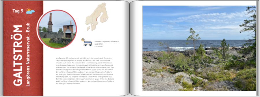 Ich habe jetzt das meiste ausprobiert, einiges finde ich gut, manches eher nicht. - Das rote Holz links bleibt. So habe ich es mir im Urlaub schon vorgestellt und gezielt nach "fotogenem" Holz gesucht. Wie Frau Holle schreibt, ist es die typische Farbe, in der die meisten Häuser in Schweden auch heute noch gestrichen werden. Im ehem. Kupferbergwerk in Falun waren wir auch. Der Bergbau wurde zwar 1992 eingestellt, aber die Pigmentfabrik Falun Rög Färg gibt es dort noch. - Der rote Rand um das runde kleine Bild bleibt, aber ich achte darauf, dass diese Bilder zumindest einen kleinen Tupfer rot enthalten, sodass das ganze harmonisch aussieht. - Als Schrift im roten Feld habe ich jetzt auch die Sweden Sans genommen. Eigentlich wollte ich da eine etwas auffälligere Schrift nehmen, so als Eyecatcher, aber durch die Drehung muss sie auch gut lesbar sein, und da habe ich (bisher) keine gute Alternative gefunden. Die Roboto vorher war einfach zu ähnlich. - "Tag x" und der Ort sind jetzt links bündig angeordnet. - Die Ideen von Heidi haben mir richtig gut gefallen. Das Wetter-Icon ist jetzt beim "Tag x", das passt sehr gut, man sieht gleich: Tag 4 war sonnig oder am Tag 20 gab es Gewitter usw. - Die Anordnung der Koordinaten im Halbkreis finde ich richtig gut, aber leider passt es einfach nicht. Die Koordinaten haben nichts mit dem Bild zu tun, sie gehören zum Übernachtungs-Icon. Leider habe ich nicht von jedem Stellplatz ein Foto so wie Du, Traumfänger, die meisten waren auch nicht so spannend. Deshalb habe ich diese Idee verworfen. Der Übernachtungsplatz bleibt deshalb rechts vom Bild. Ich werde schon noch eine Gelegenheit für die runde Schrift finden - Ich habe jetzt noch eine kleine Umrisskarte von Skandinavien eingefügt, wo ich die Tagesetappen einzeichne und mit den Landkarten-Cliparts wichtige Station kennzeichne. Das habe ich auch beim Irland-Buch gemacht, das hat sich als ganz hilfreich herausgestellt. Allerdings ist Schweden um einiges grösser als Irland, mal schauen wie ich das gut hinbekomme. - Da ich nicht die grosse Romanschreiberin bin, werden die Texte eher etwas knapper ausfallen. Der Platz unter dem Bild und dem Übernachtungsplatz reicht mir locker aus.Im Moment steht da noch Blindtext! Jetzt noch zwei Seiten, wie sie jetzt aussehen: Viele Grüsse