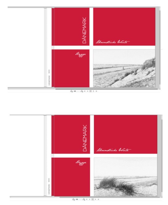 jetzt gebe ich auch noch mal meinen "Senf" dazu. Die Idee mit den Konturen finde ich sehr schön. Mir gefällt das Bild mit den Gräsern besonders gut, allerdings sieht es für mich so aus, als ob der Horizont nicht ganz gerade ist. Das solltest du noch einmal kontrollieren. Spicas Vorschlag, dem Bild keinen roten, sondern einen dezenten grauen Rahmen zu geben, kann ich nur unterstützen. Eine vertikale Ausrichtung von Überschriften gefällt mir auch nicht so gut. Da stimme ich mit narzisse überein. Vielleicht versuchst du auch mal, DÄNEMARK über die "unendliche Weite" zu setzen. Das obere linke Feld ganz frei zu lassen, hat auch für mich einen gewissen Charme. Weiterhin viel Spaß beim gestalten! Lieber Gruß Traumfänger Re: Eure Meinung zu Titel / KapiteleinleitungAch was habe ich hin und her geschoben und mit euren Anregungen gespielt. Der graue Rand ums Bild ist eindeutig schöner als mein ursprünglich roter. Mit der Schriftanordnung bin ich immer noch unsicher. Traumfängers und Narzisses Einwand zum vertikal ausgerichteten Dänemark hat mich doch ins Grübeln gebracht. Freies rotes Quadrat hat was und eigentlich geht's ja auch ums Weite also horizontale. War mir vorher nicht so aufgefallen.