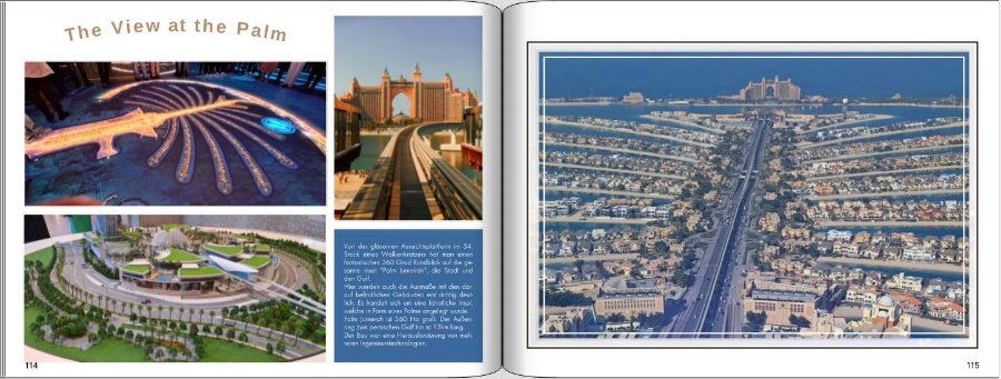 Die untere Kante des rechten Fotos würde ich dem linken Foto angleichen. Das blaue Schriftfeld sollte oben und unten mit dem linken Bild übereinstimmen. Bei der Größe des Bildes auf der rechten Seite würde ich mich an der linken Seite orientieren, d.h. den oberen Rand entsprechend dem linken oder rechten oberen Bildrand und unten entsprechend der unteren Ränder. Da solltest zu probieren, welche Bildgröße dir besser gefällt. Liebe Grüße Traumfänger Re: Neues Projekt: Kreuzfahrt von Hamburg in den Orient@danke Traumfänger, die linke Seite des zweiten Beispiels habe ich entsprechend Deiner Vorschläge abgeändert.