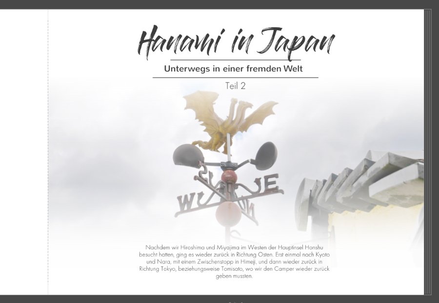 Wir laden Sie herzlich ein, die neue CEWE Community mit integriertem Forum zu entdecken und künftig zu nutzen. Das bisherige Forum, in dem Sie sich gerade befinden, steht nur noch bis Ende 2025 für neue Beiträge zur Verfügung und wird ab dem kommenden Jahr 2026 nur noch lesend zugänglich sein. Informieren und registrieren Sie sich jetzt in der neuen CEWE Community – wir freuen uns auf Sie! Re: JapanHier das Ergebnis. Das Datum musste für "Teil 1/2" weichen, das werde ich vermutlich noch auf der Übersichtsseite unterbringen. Ich wollte unbedingt dieses Bild irgendwo im Buch unterbringen, keine Ahnung wieso, aber ich liebe dieses Bild einfach... Ich dachte hier passt es ganz gut, denn dann kann ich den neuen Text auch passend formulieren.