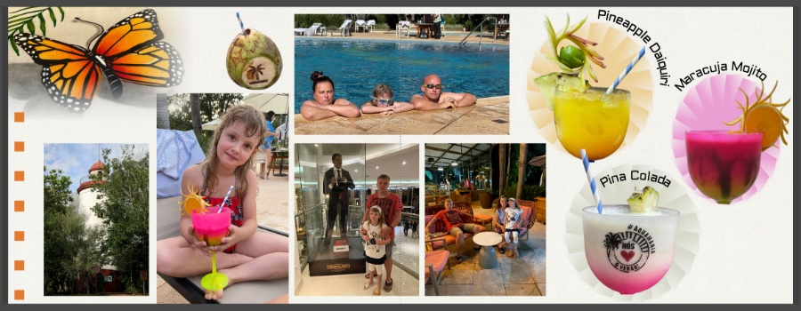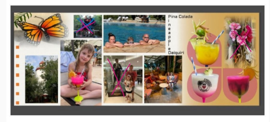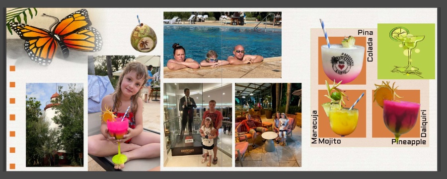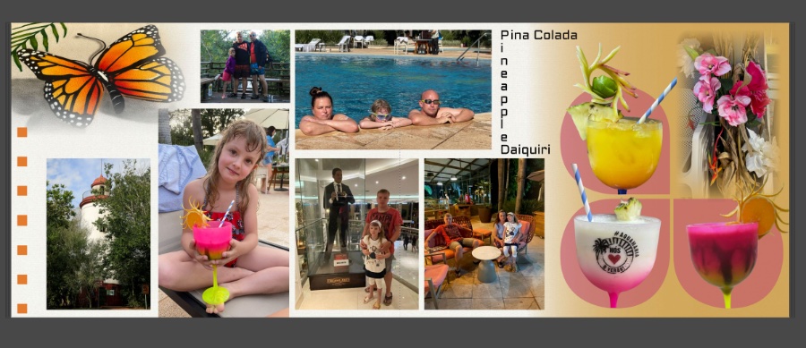 Außerdem würde ich sogar neben den Getränken nur ein großes Foto platzieren. Entweder das am Pool oder in der Hotel Lobby, welches Dir besser gefällt oder farblich besser zu den anderen Fotos passt. Das kleine Foto oberhalb Eurer Tochter würde ich ganz weglassen. Dafür das Foto an der unteren Linie des Turmes anpassen. Evtl. den Schmetterling etwas verkleinern.