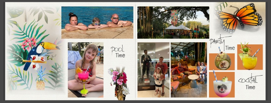Die Seite ist jetzt richtig schön geworden. Der Tukan links und der Schmetterling rechts machen die Doppelseite richtig lebhaft, ohne überladen zu sein. Sehr gut gelöst das "Alkoholproblem". Vielleicht findest Du für Pooltime noch ein Clipart oder ein Foto, das mehr zum Pool passt, z.B. eine gelbe Ente? Evtl täuscht das am Handy, aber der Abstand oben und unten zum Buchrand ist nicht gleich?