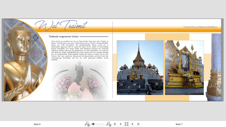 Ich hatte fast 2000 Fotos. Da wir auch noch in Angkor Wat waren, habe ich sogar drei Bücher gemacht D:oops:, 2 von Bangkok und eines von Angkor. Und ich habe rund 30 Seiten mit sehr viel Text. Die Fotos, die ich in diesem Teil verwendet habe, sind eher „erinnerungswürdig“, daher habe ich mich auf kleinere Darstellung beschränkt. Dennoch habe ich versucht, den Stil irgendwie beizubehalten. Ich hänge mal ein paar Seiten an, vielleicht gibt dir das ein paar Ideen.