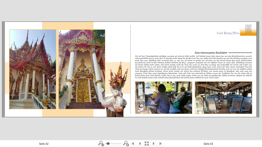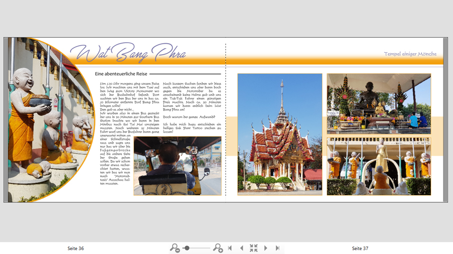 Da ich mich ausgiebig mit diesem Layout beschäftigt habe, möchte ich dir auch zeigen, wie ich Seiten mit viel Text gestaltet habe. Offensichtlich ist dir das Erlebnis im Wat Bang Phra ja sehr wichtig (hast du dir ein Tattoo stechen lassen?). Also gib ihm Raum! Es ist dein Buch und darin präsentierst du deine Erinnerungen. Weiche nicht ab vom anderen Layout, setzt die Fotos mit Abstand zueinander und platziere den Text großzügig. Wie schon pitty und Rotuma geschrieben haben: geh nicht so nah an den Rand, denn irgendwie sehen deine Seiten überfüllt aus. Und wenn es dann am Ende drei Seiten sind, ist das doch auch in Ordnung.