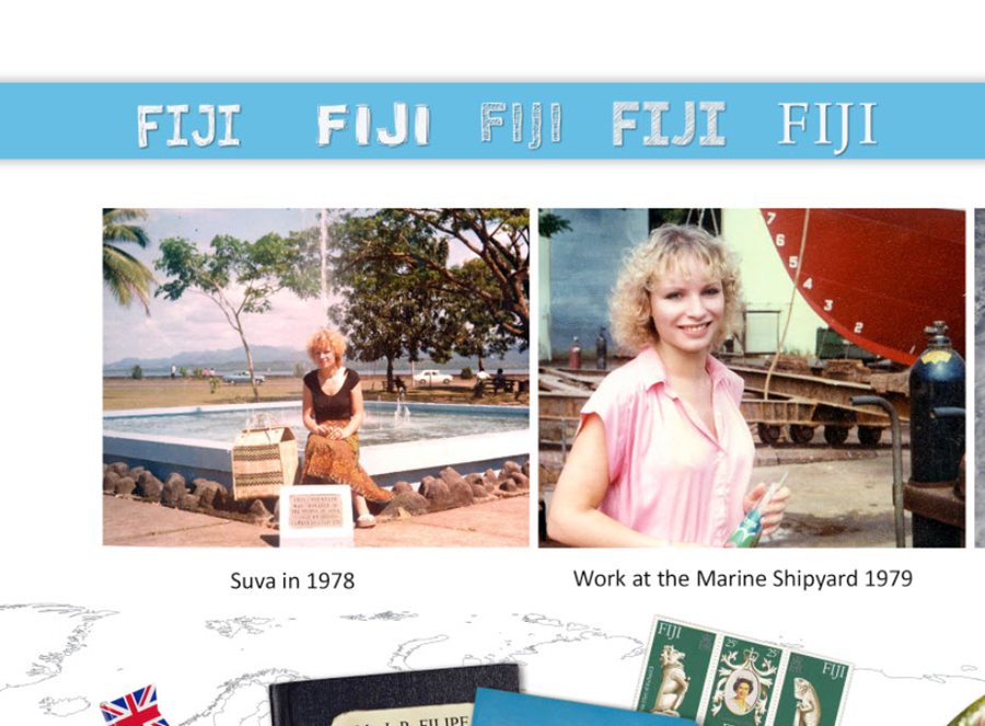 Pro Land vergebe ich eine Doppelseite. Begonnen habe ich erst einmal mit der Auswanderung von England zu den Fiji Inseln in 1978 bis 1988 mit einigen Dienstreisen dazwischen. Ich habe damals kaum fotografiert, auch die Qualität ist nicht besonders. Landschaftsfotos kommen nicht viel vor, machen in dieser Größe auch kaum Sinn, aber Bilder mit mir und meinen Tieren. Die Fotos sind 6,5cm breit. Der Fließtext ist zurzeit Mongolian Baiti 9pt, dabei handelt es sich hauptsächlich um Info. Irgendwo möchte ich noch private kleine Geschichten unterbringen, die sich von der Info unterscheiden soll. Habe es mit Italic und Handschrift versucht, bin aber nicht glücklich damit. Irgendwelche Ideen dazu?