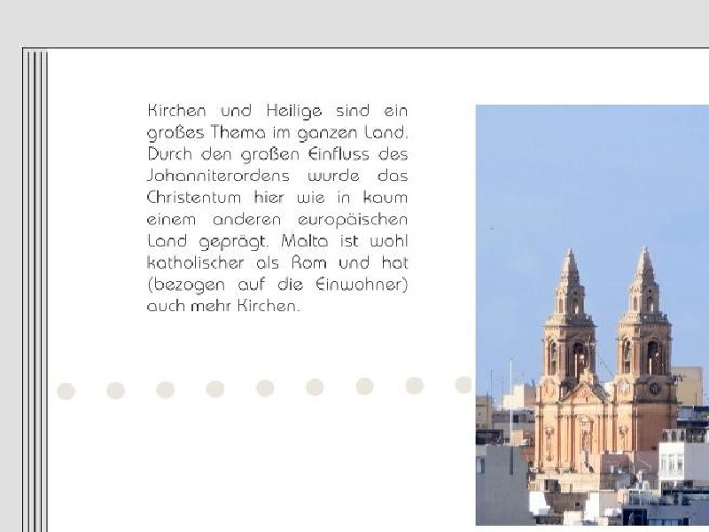 • mir die Überschrift nicht gefällt. Das ist einerseits mein persönlicher Geschmack. Andererseits wirkt der Schriftzug Valletta sehr hart (nahezu kriegerisch) und nicht passend zu den zarten Farben. Außerdem ist das Kerning nicht harmonisch - z.B. zwischen V und A in Valletta zwischen L und T und T und A in Malta sowie insgesamt dort zu eng.
