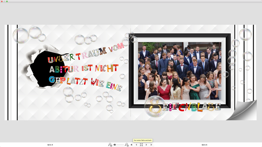 für mich wirken die Seiten sehr stimmig (und fröhlich) Auf der ersten Seite verwirrt mich das "schwarze Loch" ein klein wenig. Mit Seifenblasen hat das ja nix zu tun, und irgendwie ist es seeeehr dominant. Evtl. lässt Du das Loch einfach mal weg. Die Idee mit dem Text-Kopf finde ich auch wunderbar. Allerdings fällt mir ein Eck auf der Rückseite auf. Ich glaube, ich würde versuchen, da noch ein wenig "Fülltext" reinzubasteln. Ansonsten: Herzlichen Glückwunsch zum Abi :-) Gruß DSL-schnell
