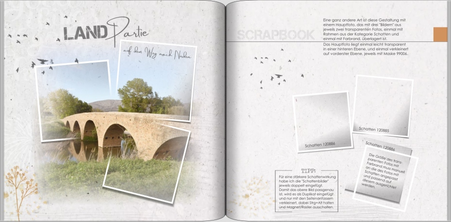 M.W. hat Sonax verschiedene Rahmen etc. z.B. bei oscraps gekauft. Aber diese Seite könnte man auch mit cewe erstellen. Auf ein Foto mit Verlauf legst Du 3 transparente Fotos mit unterschiedlichen Schatten und Rahmen. Unter/über das Foto stark transparente unregelmäßige Cliparts z.B. aus Formen. Die Schnüre gibt es bei cewe nicht, ließen sich aber im www oder vielleicht auch über philis Scrapbookfibel finden.