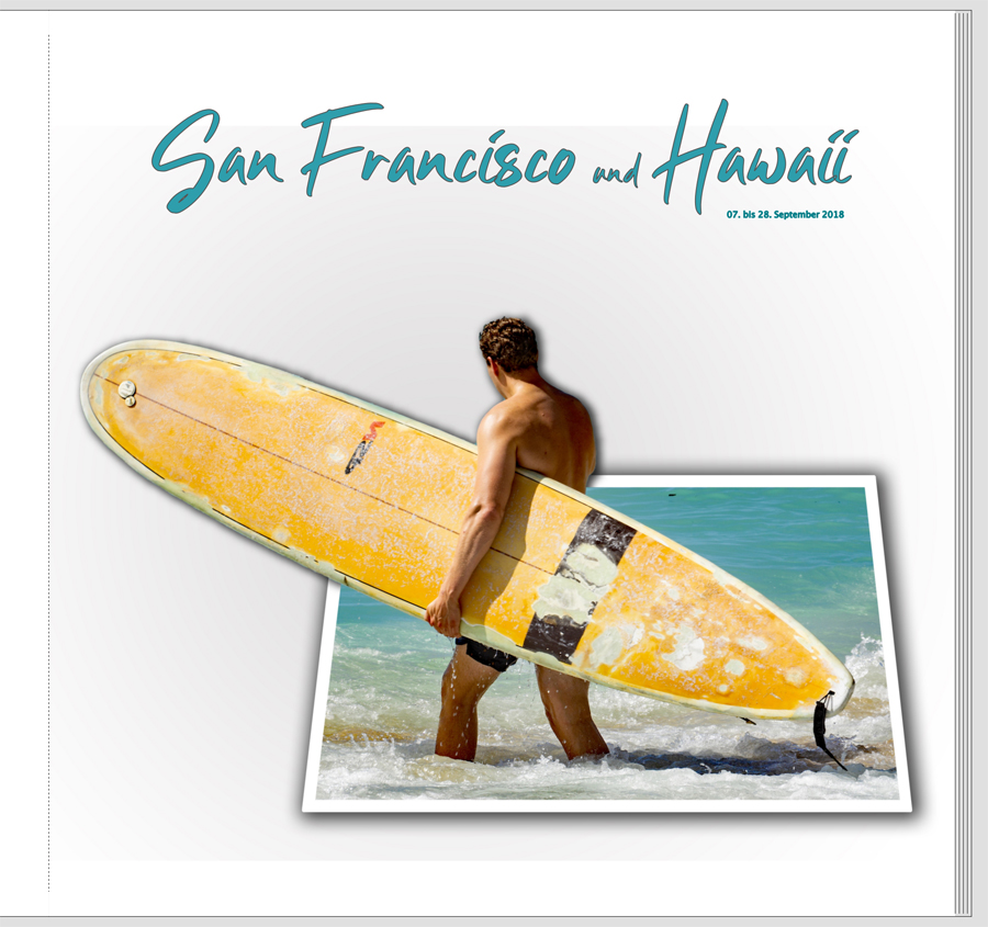 Schau trotzdem nochmals auf "San Fran...". Ich glaube, da ist noch immer eine minimale schwarze Kontur im Textfeld eingestellt. Ohne Kontur würde das Türkis noch frischer wirken. Das Verhältnis Datum zu Überschrift würde ich auch noch mehr verändern. Schau mal diese Idee: Die beiden Ziele sind in Clattering 96pt, das Wörtchen "und" in 36pt und die Leerabstände vor und nach "und" in 82pt geschrieben. Das Datum darunter ist in Calibri 12pt angelegt. Ich mag inzwischen den Monat ausgeschrieben lieber und lasse auch führende Nullen beim Datum in Fotobüchern weg. Auf mich wirken die Nullen immer so buchhalterisch. Aber das ist sicher persönliches Gusto. Liebe Grüße
