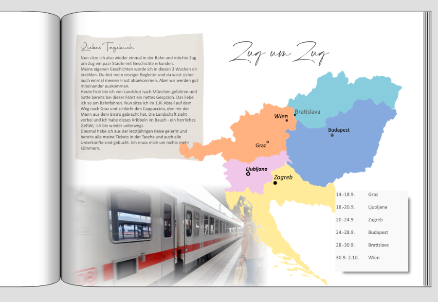 Ich möchte bei unterschiedlichen Hintergründen und Überschriften bleiben, daher habe ich euch mal von 4 Städten jeweils die Startseite angehängt. Dazu dann auch angepasst verschiedenfarbige "Notizzettel". Dazu musste ich allerdings das Clipart wechseln, dieses ist ohne Schattierung und daher einfacher umzufärben. Schreibschrift im Tagebuch ist problematisch, ich schreibe doch recht viel und möchte die Lesbarkeit erhalten. Mit immer gleichgroßen Zetteln hadere ich noch. Ich möchte nicht nur einen Zettel pro Tag, das würde zu viel Text auf einmal, außerdem habe ich ja auch wirklich mehrmals am Tag geschrieben. Die Themen wären manchmal zu weit entfernt von den passenden Fotos. Noch eine Frage: Ich suche immer noch nach einer passenden Zielbeschreibung. Das sind alles Länder des früheren Großösterreich, also K.u.K.Monarchie. Aber es geht ja nicht wirklich um Politik. Balkan ist es auch noch nicht. Südosteuropa auch nicht. Den Begriff "Zug um Zug" möchte ich gerne beibehalten, denn so hieß auch mein Reisebuch 2021, damals nach Oberitalien. Bitte seid so lieb und schaut nochmal drüber. Ich nehme gerne Kritiken und Ratschläge an. Danke schon mal Monika