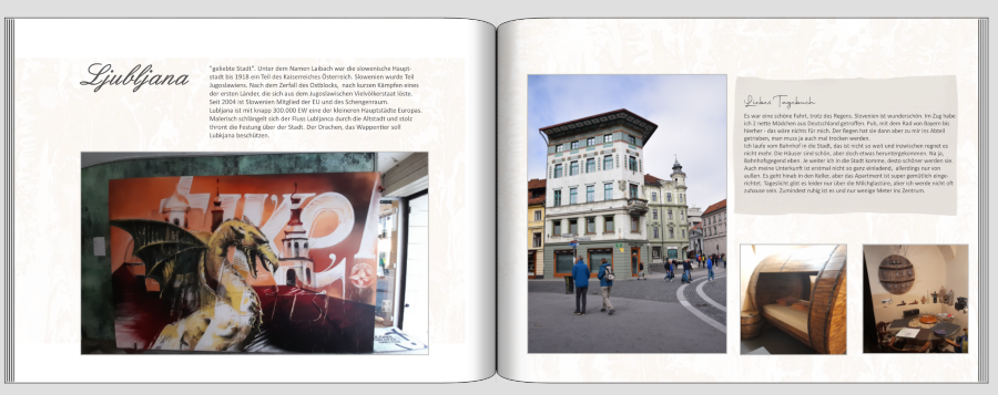 Ich habe ja, als du das Thema erstmals aufgeworfen hast, schon geschrieben, dass ich eine andere Schrift für jede Stadt nicht schlecht finde. Leider war das eine absolute Minderheiten-Meinung! Ich verarbeite derzeit eine Städtereise in einem bzw. mehreren Fotobüchern und ich habe diesmal zum ersten Mal intensiv mit Schriften experimentiert. D. h. ich habe z. B. für Parkanlagen, moderne Bauten, Kunstwerke, Street Art, Spaziergänge etc. jeweils eine andere Schriftart genommen. Das sind sehr viele verschiedene Schriftarten und nicht nur sechs wie in deinem Fall. Ich habe allerdings zumindest die linke Einleitungsseite meist einheitlich gestaltet. Und das wäre vielleicht auch eine Möglichkeit für dich. Bei deinen Beispielen hast du oben links immer den Stadtnamen, rechts davon eine Beschreibung und darunter ein Bild im Querformat. Nur bei Zagreb hast du zwei Bilder und zusätzlich ein Wappen auf der linken Seite. Wenn du das einheitlich gestaltest (Textfelder gleich breit, Bild gleich groß), bringt das eventuell Ruhe ins Fotobuch. Verwendest du den gleichen Hintergrund wie auf der Einleitungsseite dann für alle Seiten zur jeweiligen Stadt? Wenn ja, würde ich das so quasi als "roten Faden" sehen. Falls nicht, wäre ein einheitlicher Hintergrund für alle Einleitungsseiten vielleicht besser. Zu den Tagebucheinträgen: Hast du schon mal daran gedacht, einen fixen Platz für "Liebes Tagebuch" vorzusehen, z. B. die rechte Hälfte der rechten Seite. Dass manchmal mehr, manchmal weniger Text steht, würde mich nicht stören. Das ist bei meinem aktuellen Projekt auch so. Weiterhin viel Spaß! LG Basilikum