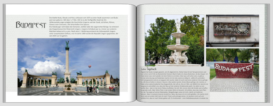 zu deinen Tagebucheinträgen hätte ich auch noch einen Gedanken. Wie wäre es, wenn du deine handgeschriebenen Einträge - also mit deiner eigenen Handschrift - einscannen und dann jeweils ins Fotobuch einfügen würdest? Das wäre dann noch viel persönlicher. Ich weiß nicht, ob es mit der Größe passt, damit man die Einträge auch noch lesen kann, aber eine Überlegung wäre es evtl. wert. Weiterhin viel Spaß, ich sitze auch gerade grübelnd an einem Städte-Fotobuch und bin gerade bei Budapest. Eine tolle Stadt! LG