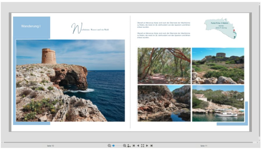 ich sitze seit Wochen ideenlos vor einem Projekt. Ich war 2 Wochen in Menorca auf dem Camí de Cavalls wandern. Viel Landschaft, wenig Kultur. Ich möchte die Seiten so gestalten, dass sich die Wanderungen nicht vermischen. Die Fotos sind teils sehr unterschiedlich, da wir auf den einzelnen Wanderungen durch teils unterschiedliche Gegenden gekommen sind.