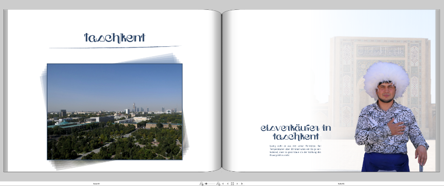 ich habe gerade mit meinen FB angefangen und kann mich nicht entscheiden, wie die jeweilige Kapitaleinleitung aussehen soll. Außer den Gebäuden haben mich die Menschen mit ihrer Offenheit und Freundlichkeit beeindruckt. Aus diesem Grund soll bei jeder Kapiteleinleitung immer ein Porträt einer Person aus der jeweiligen Stadt gezeigt werden. Aber wie anordnen. Text mit oder ohne Rahmen? Mit weiteren Infos zur besuchten Stadt oder lieber clean? Ich freu mich auf eure Meinungen und Anregungen.