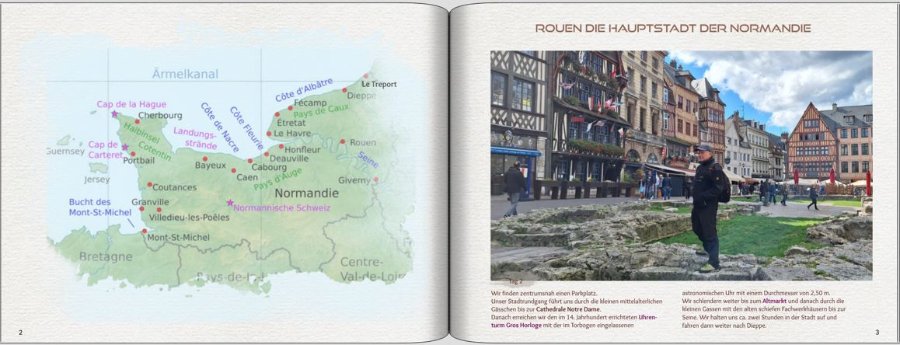 ich würde in beiden Fällen die Karte auf die linke Seite legen. So, mit der Karte rechts, sieht es bei der Normandie fast so aus, als würde Dein Mann gleich aus dem Buch raus gehen. Und in der Bretagne führt der Weg in einem Bogen nach links direkt zum Mont St. Michel und dann weiter zur Karte, die perfekte Blickführung.