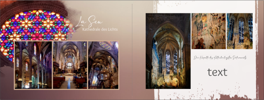 Was mich am meisten stört ist, dass die beiden Seiten bezüglich der Kathedrale (außen und innen) nicht so wirklich zueinander passen. Es soll die Kathedrale des Lichts sein und du verwendest einen düsteren Hintergrund, das ist für mich nicht stimmig. In den Fotos lässt sich der blaue Farbton auch finden, insofern würde auch das Blau der vorherigen Seite passen, allerdings nicht ganz so massiv, wie du das mit dem dunklen Farbton gemacht hast.